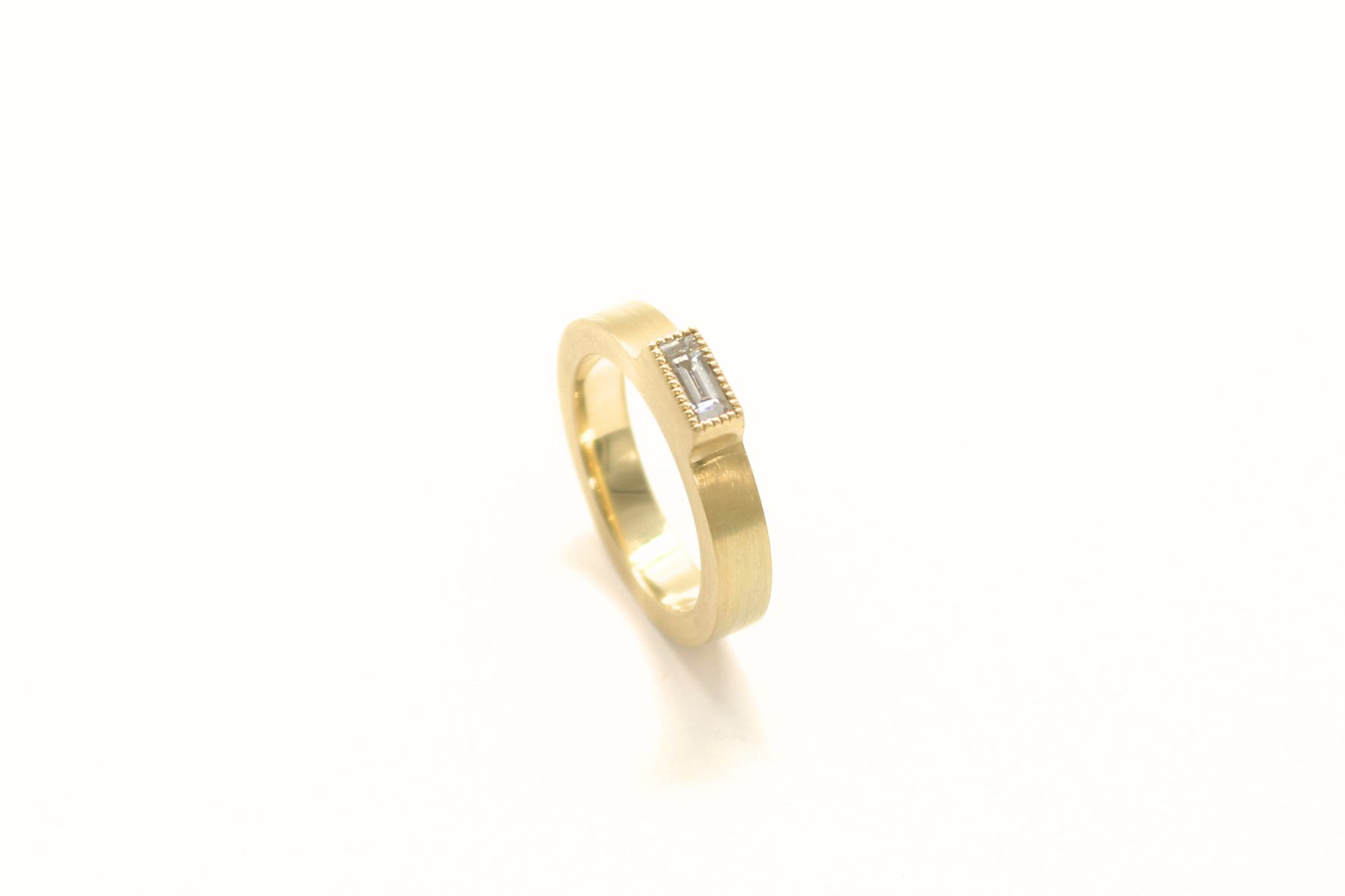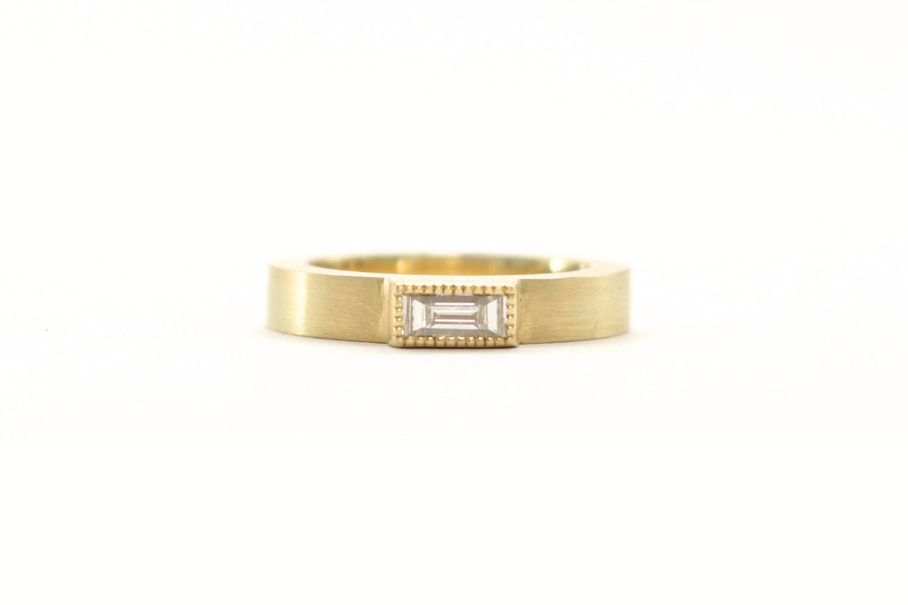 Atelier Zwei & Neunzig Ring aus 585/- Gelbgold und Baguette Diamant gefasst in einer Zargenfassung mit Millgriff.